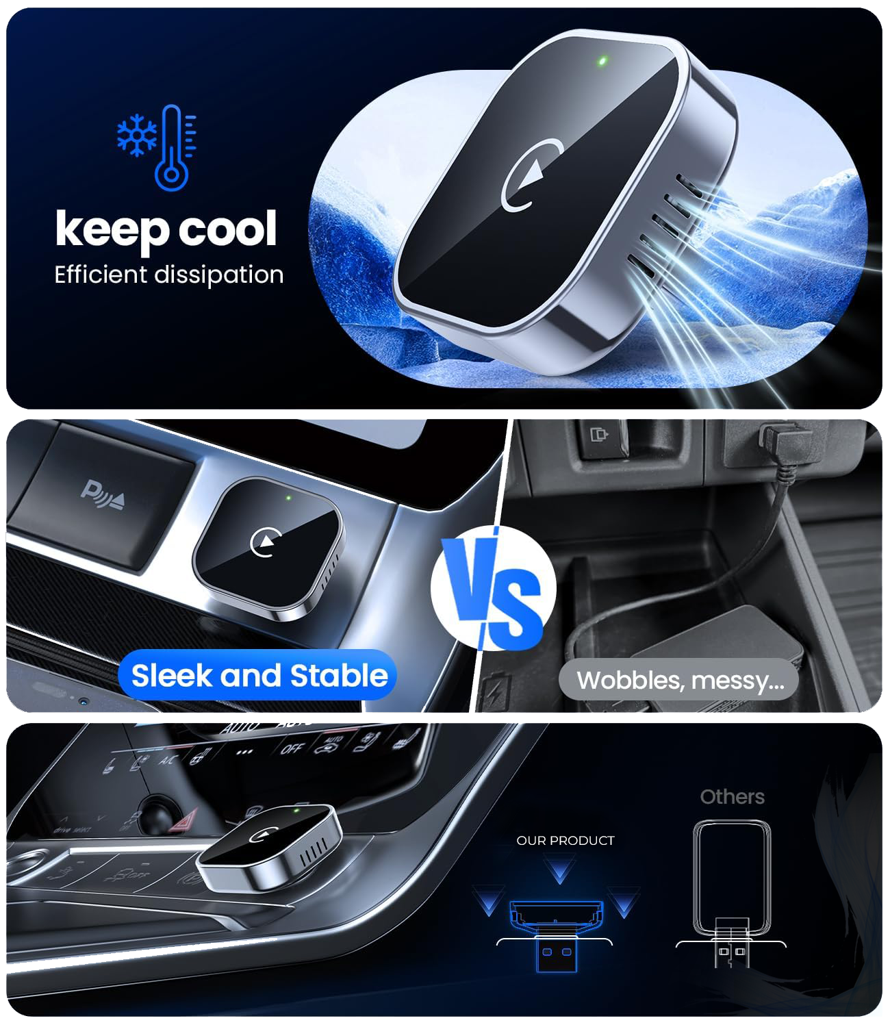 Wireless design eliminates cable-related issues.Auto-activates CarPlay when starting your car.Stable, low-latency connection between your iPhone and vehicle. No need to plug/unplug phone or risk forgetting it in the car.